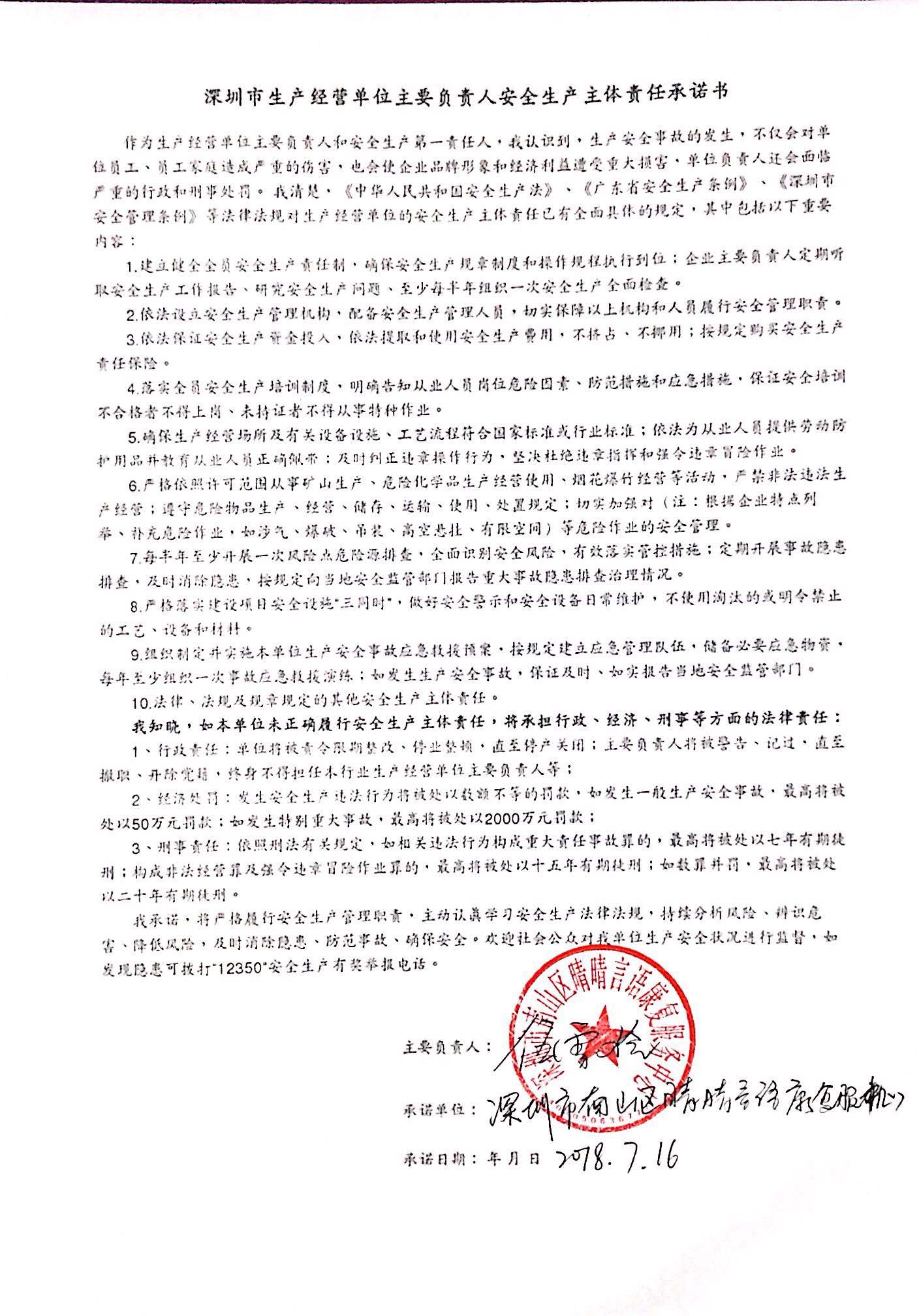 深圳市生产经营单位主要负责人安全生产主体责任承诺书