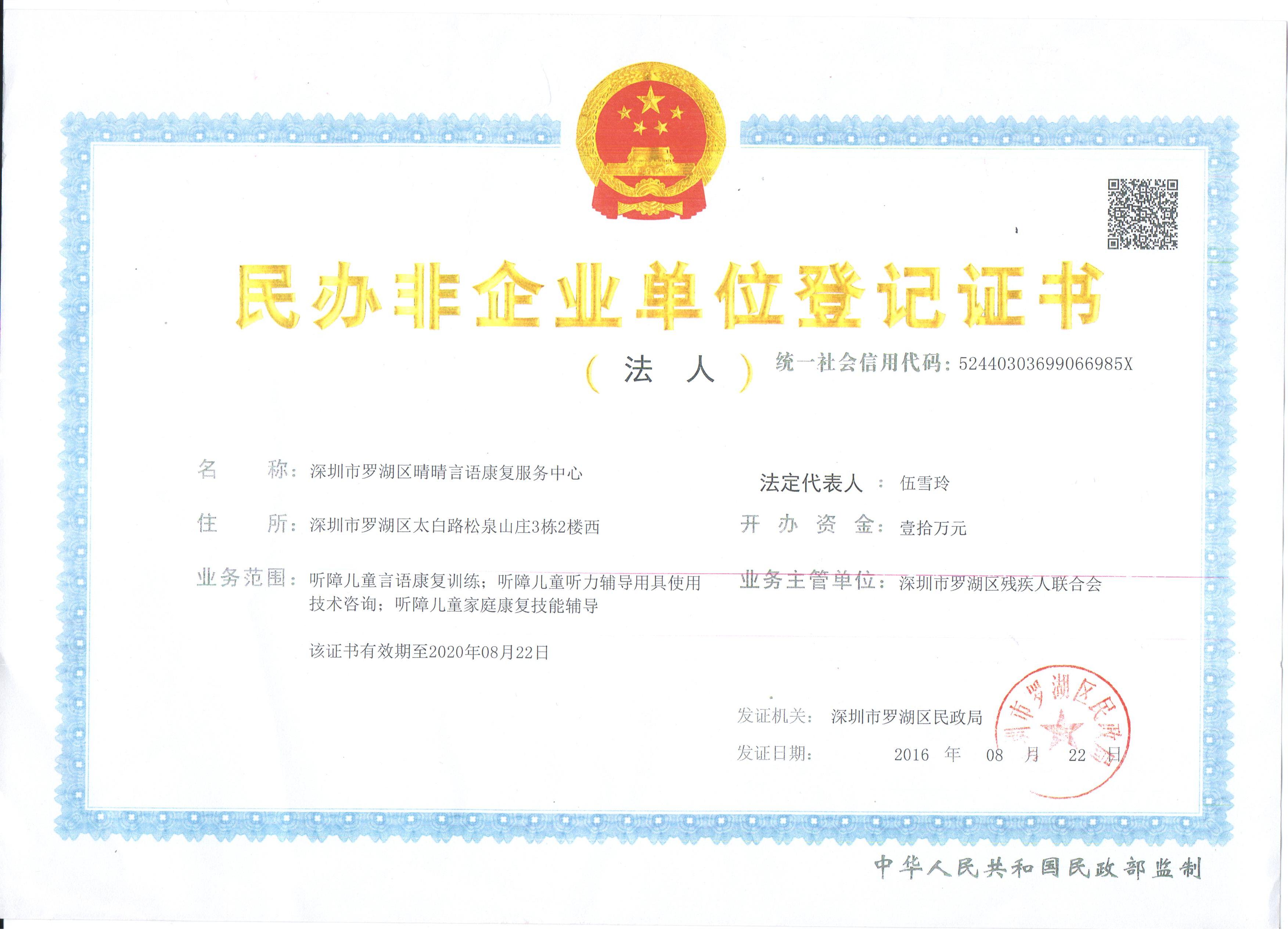 罗湖区晴晴言语《登记证书》