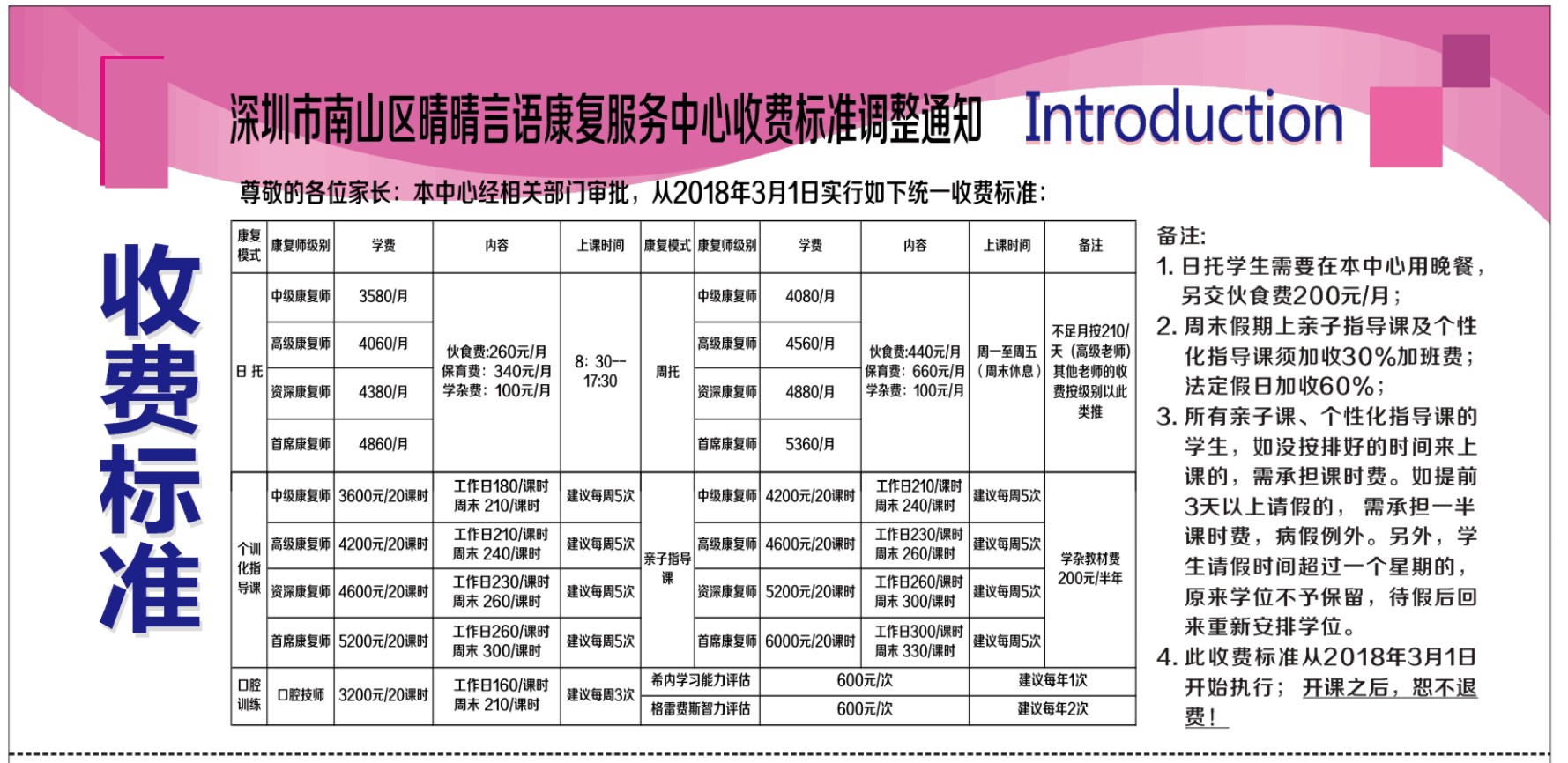 南山晴晴言语康复服务中心收费标准(2018年3月)