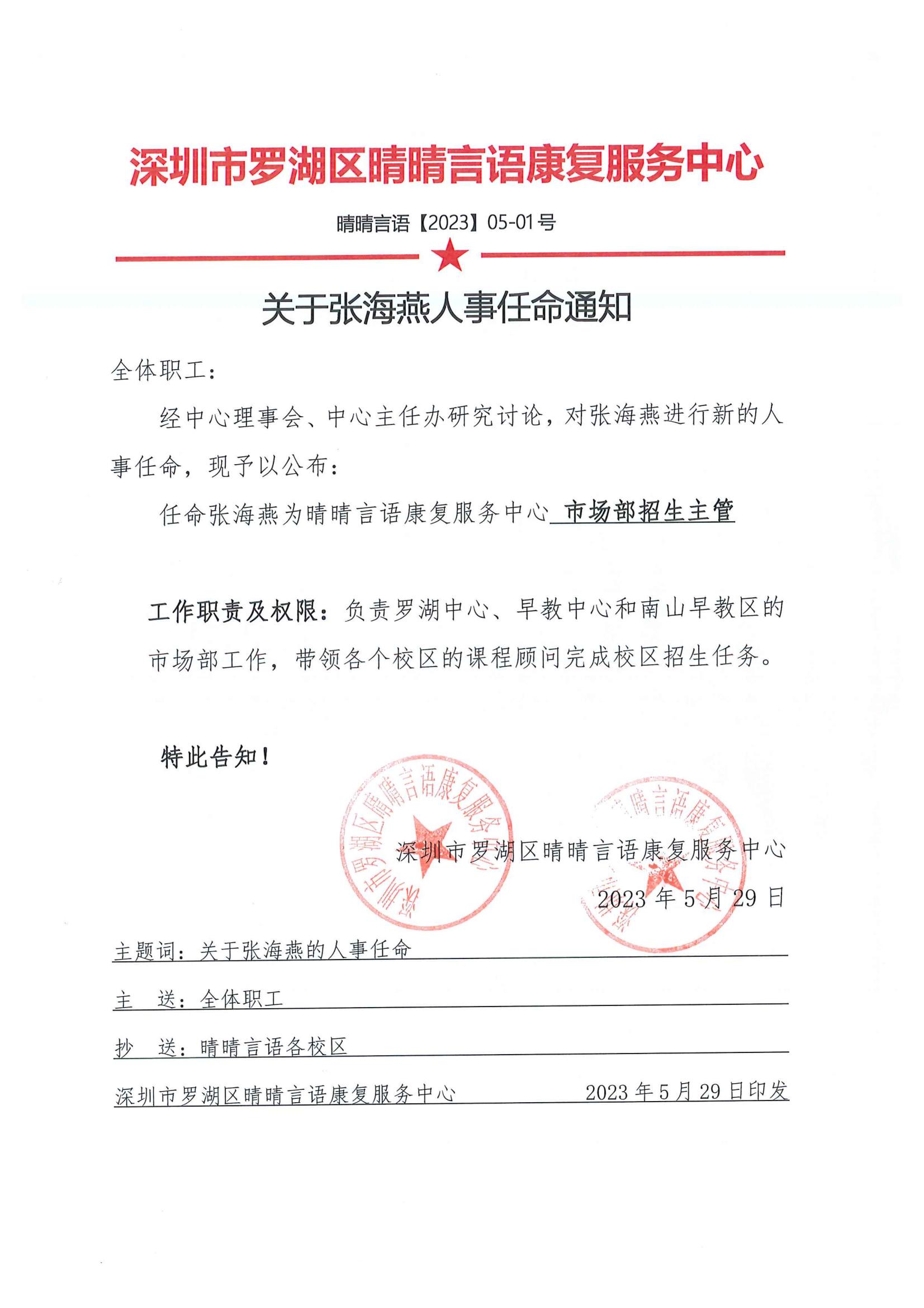 关于张海燕人事任命通知