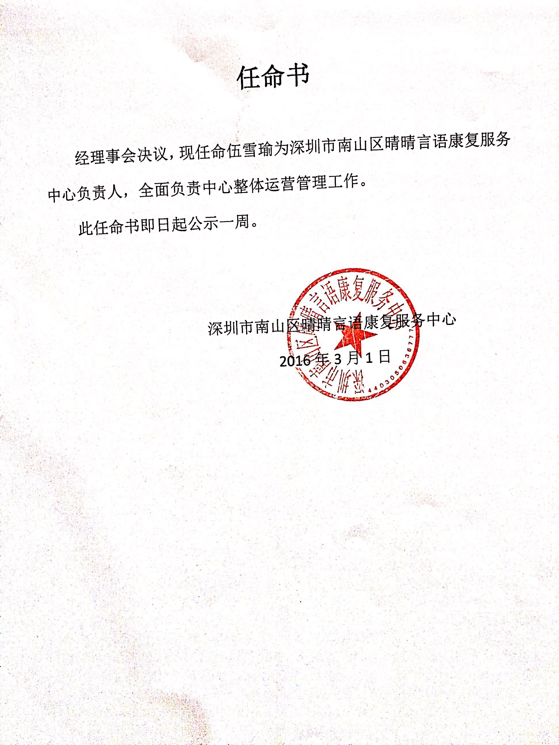 南山区负责人《任命书》
