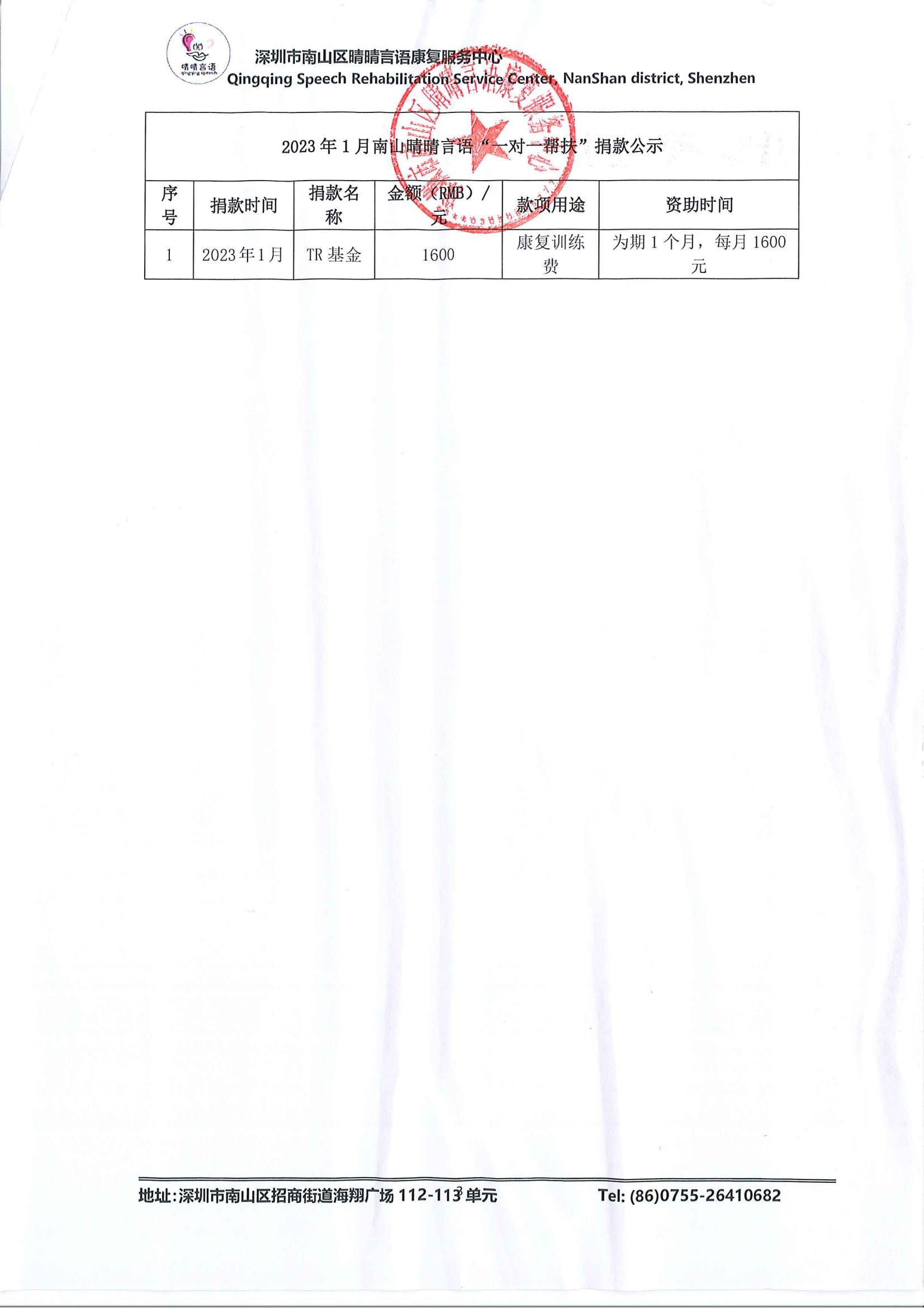 2023年南山晴晴言语捐赠使用情况