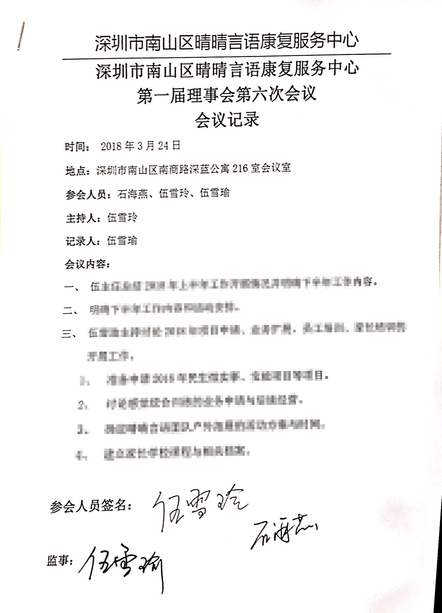 南山区晴晴言语第一届第六次理事会会议纪要