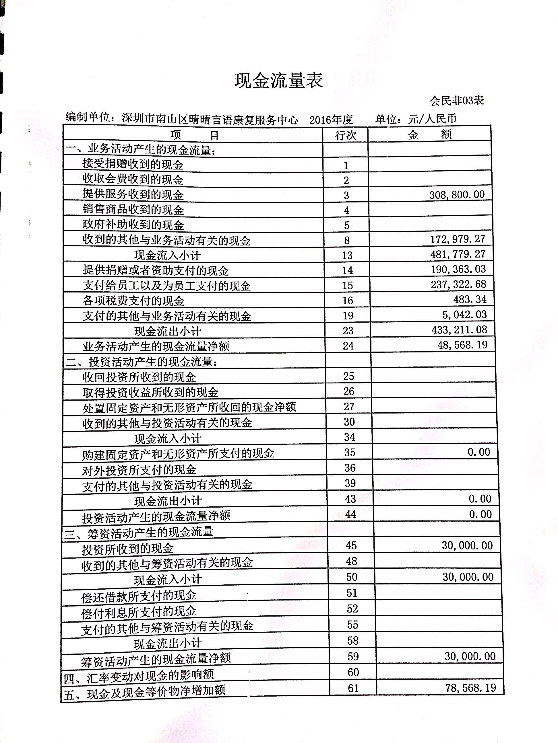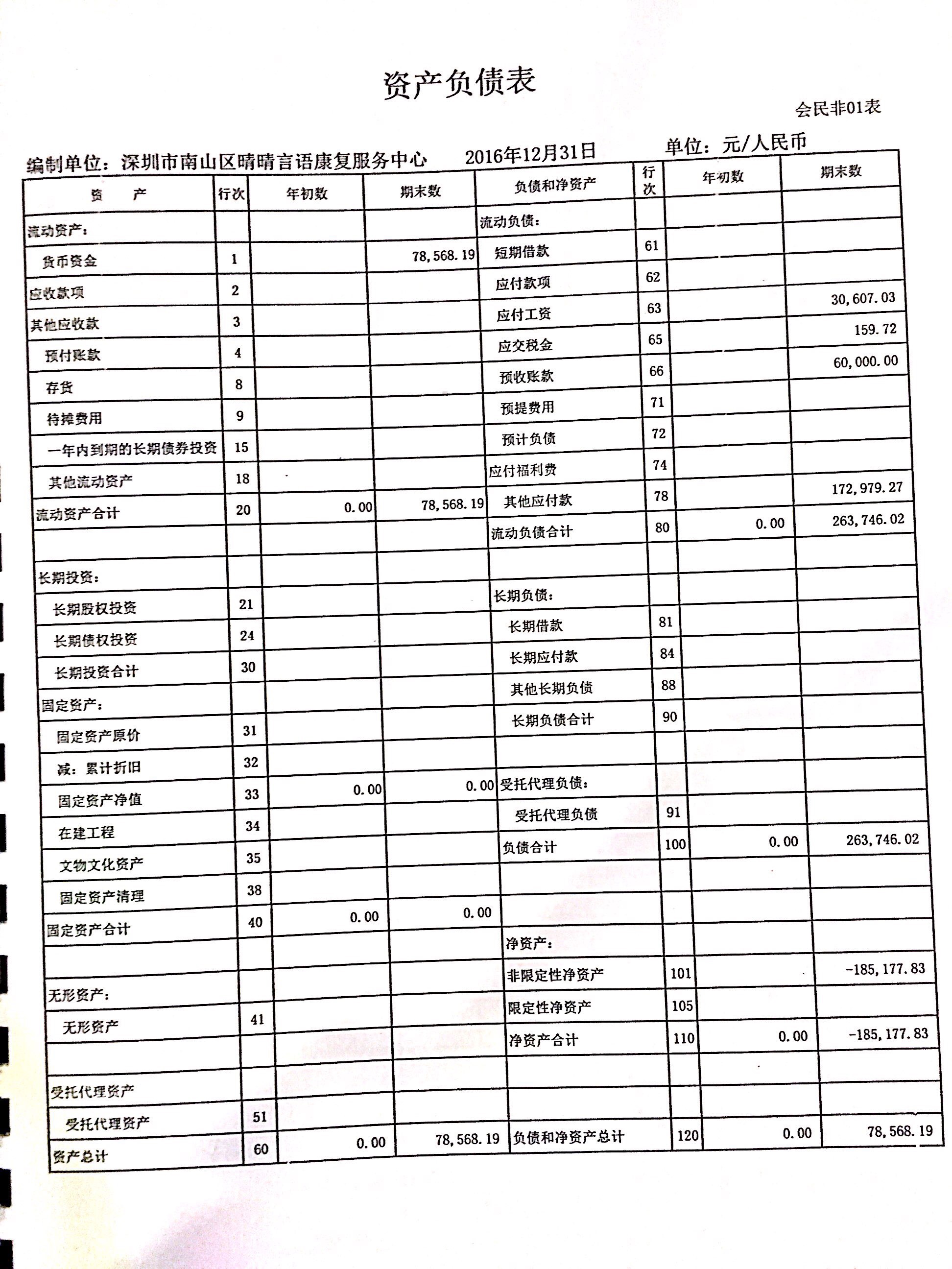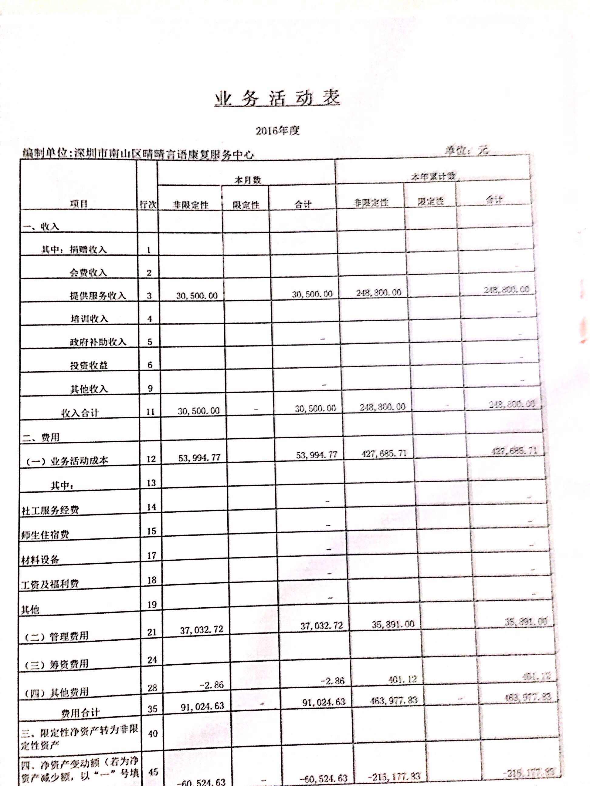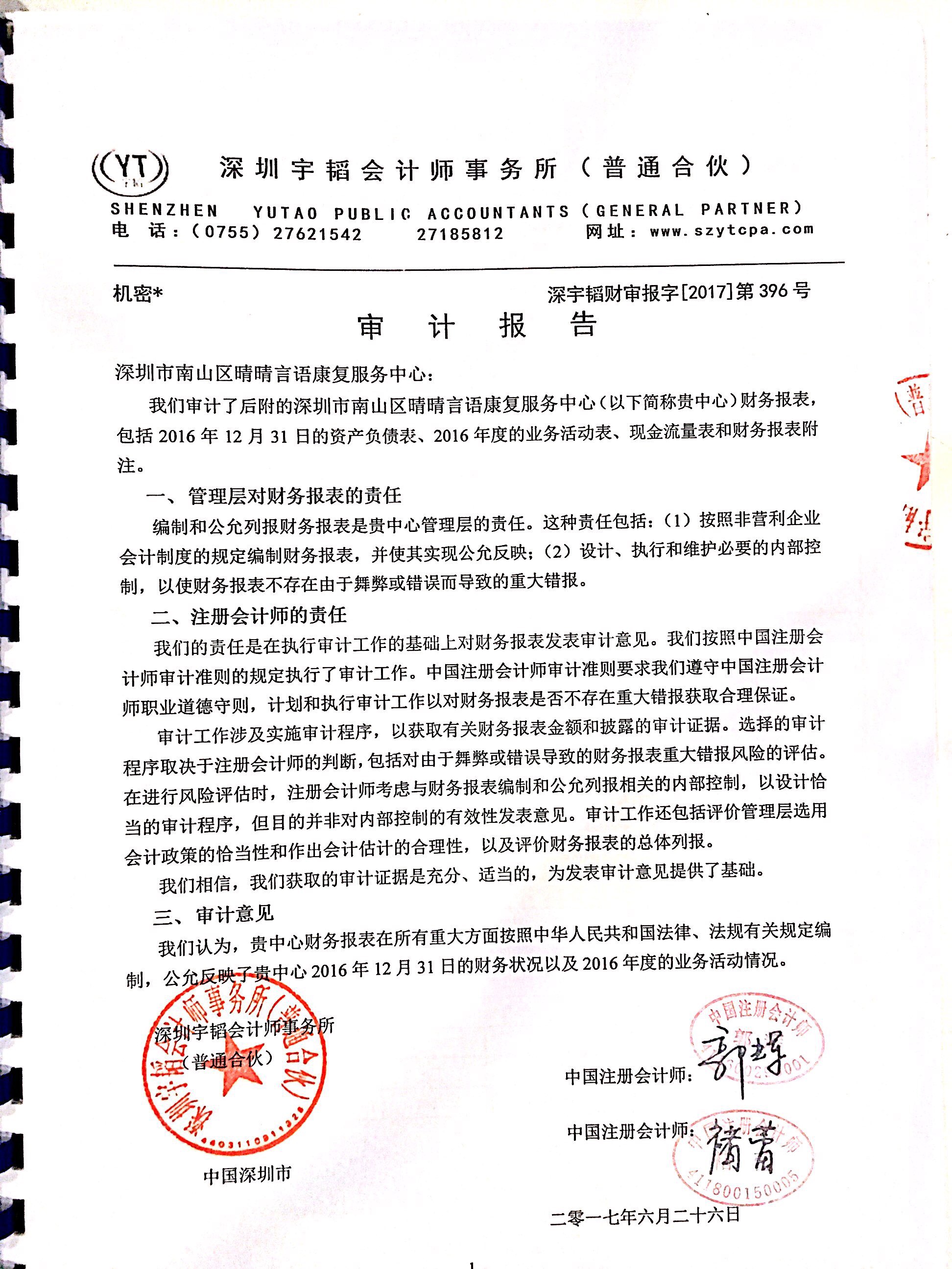 深圳市南山区晴晴言语康复服务中心2016年审计报告