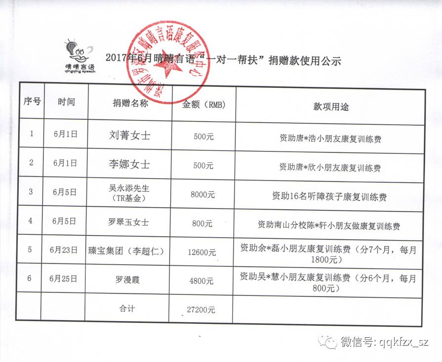 以下是2017年6月份晴晴言语所接受的善款和使用公示:
