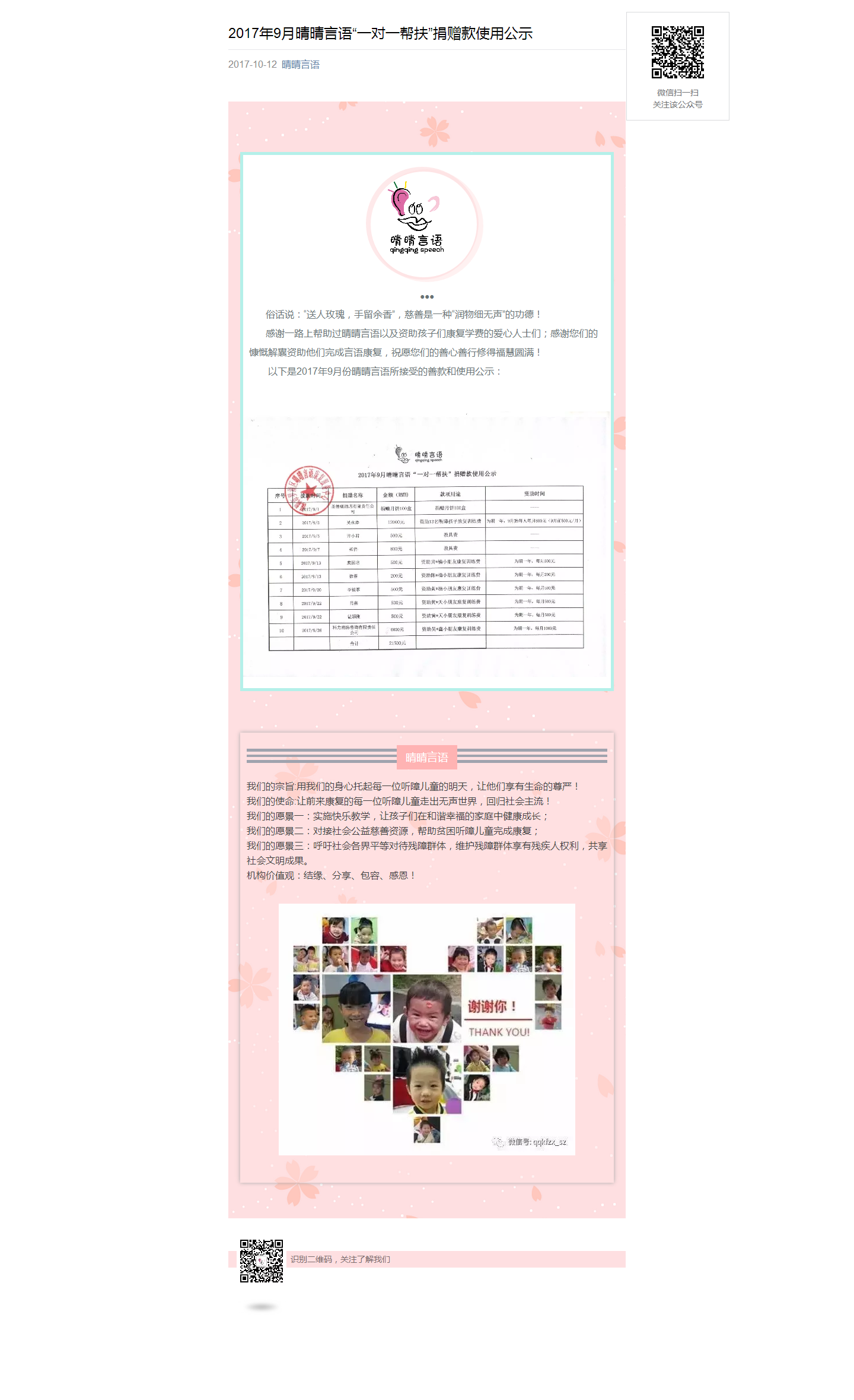 2017年10月晴晴言语“一对一帮扶”捐赠款使用公示