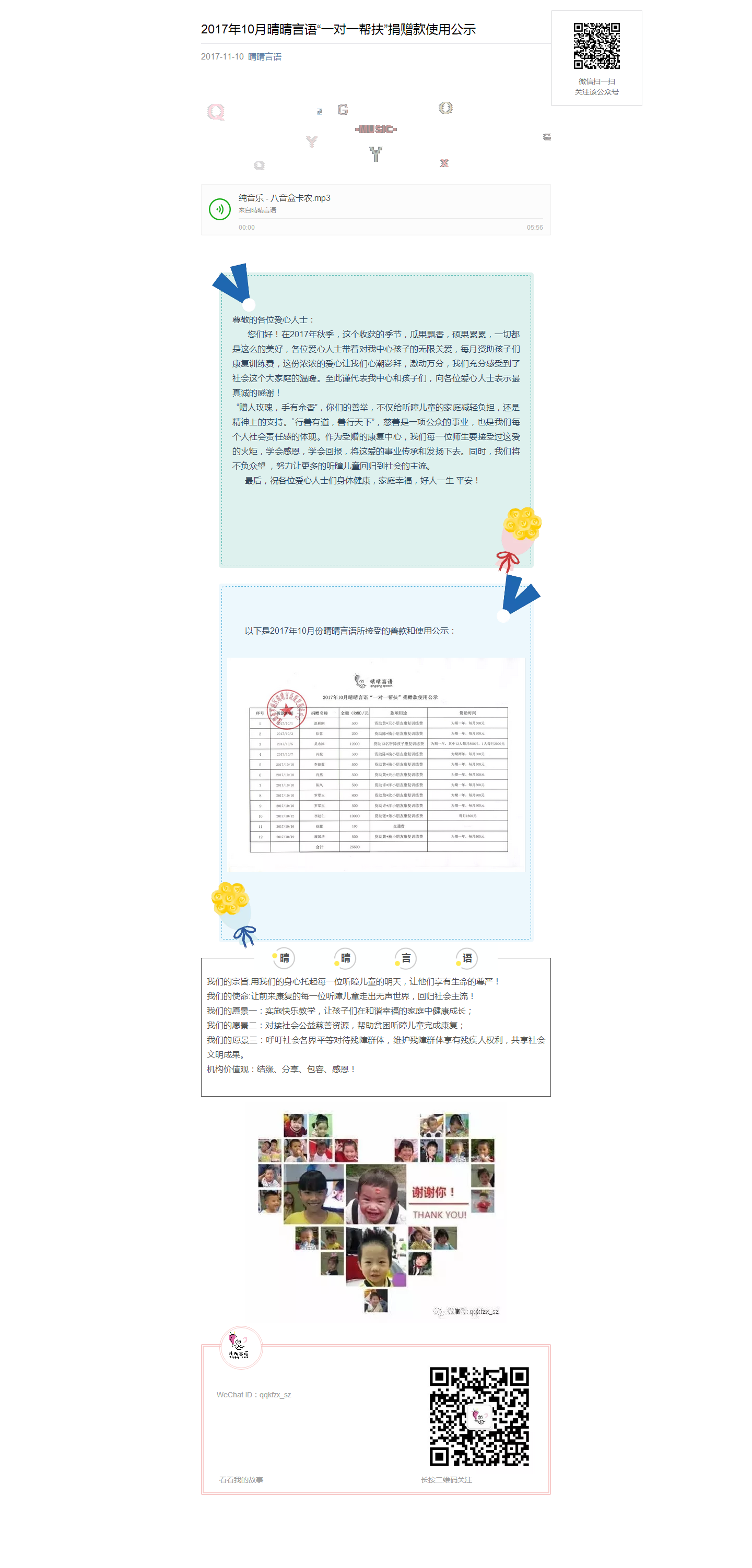 2017年10月晴晴言语“一对一帮扶”捐赠款使用公示
