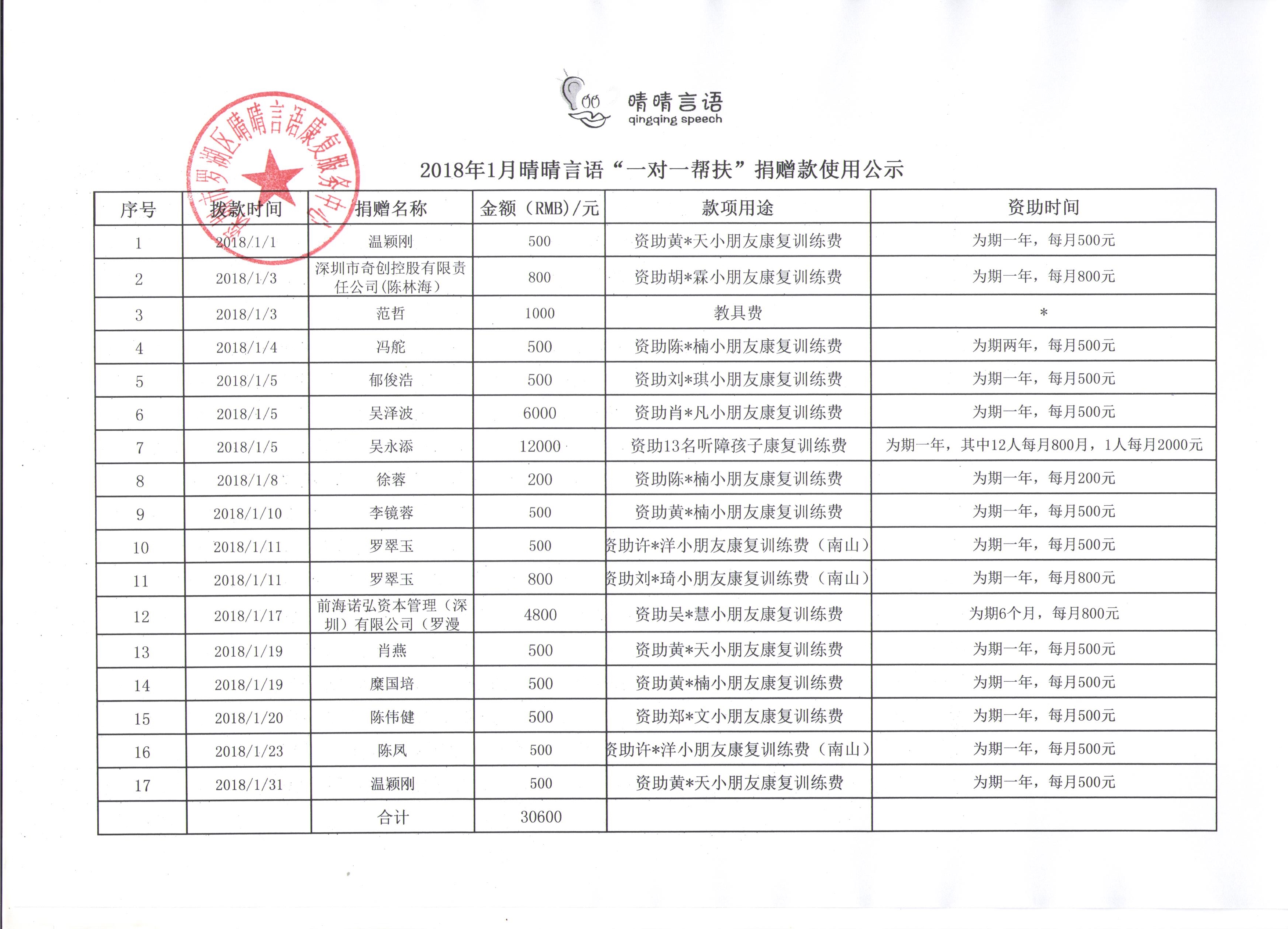 2018年1月晴晴言语“一对一帮扶”捐赠款使用公示