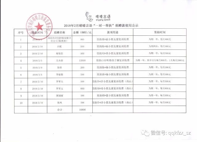 2018年2月晴晴言语“一对一帮扶”捐赠款使用公示