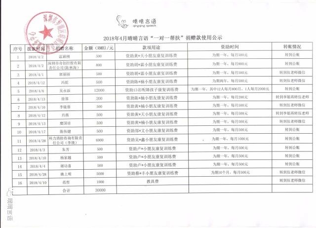 2018年4月晴晴言语“一对一帮扶”捐赠款使用公示