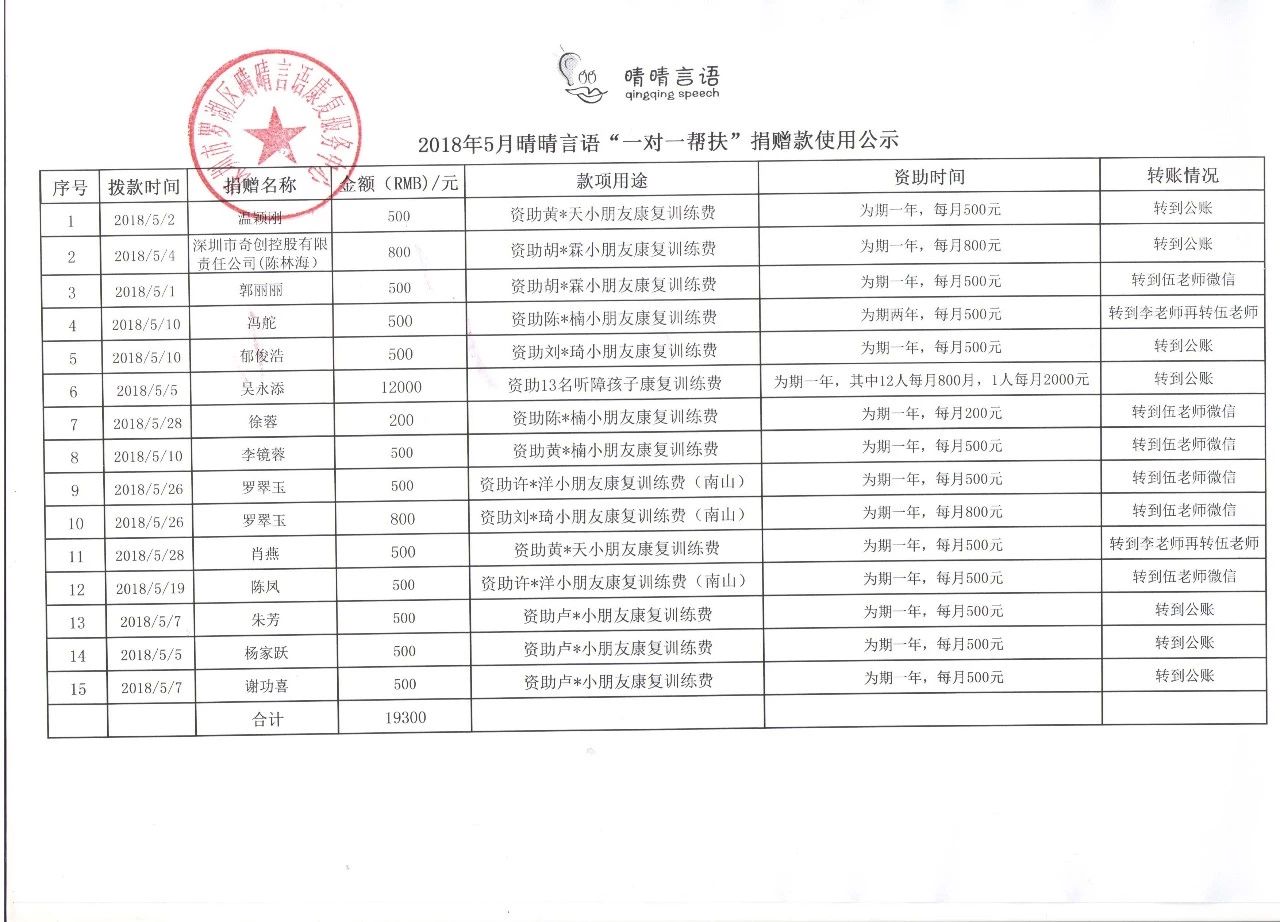 2018年5月晴晴言语“一对一帮扶”捐赠款使用公示