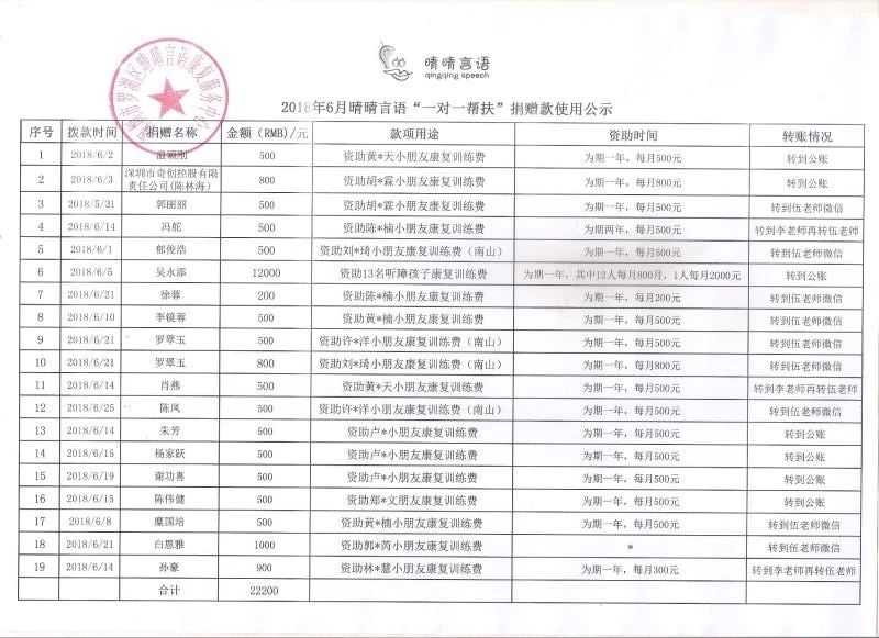 2018年6月晴晴言语“一对一帮扶”捐赠款使用公示