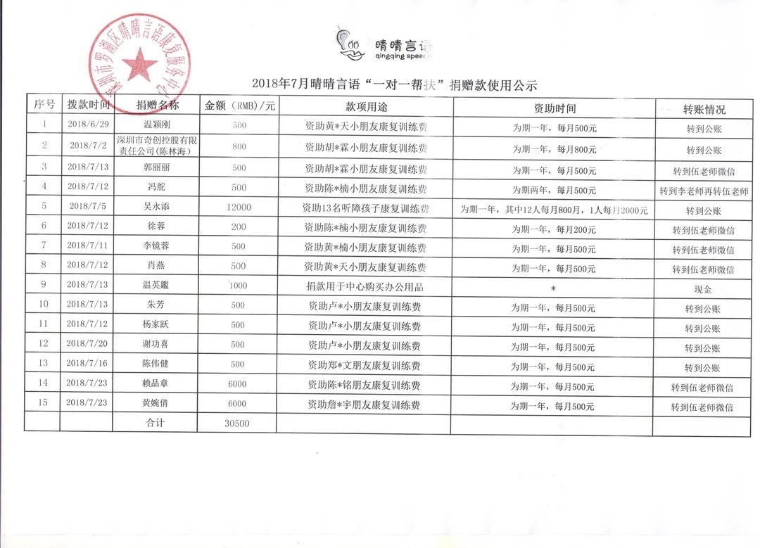 2018年7月晴晴言语“一对一帮扶”捐赠款使用公示