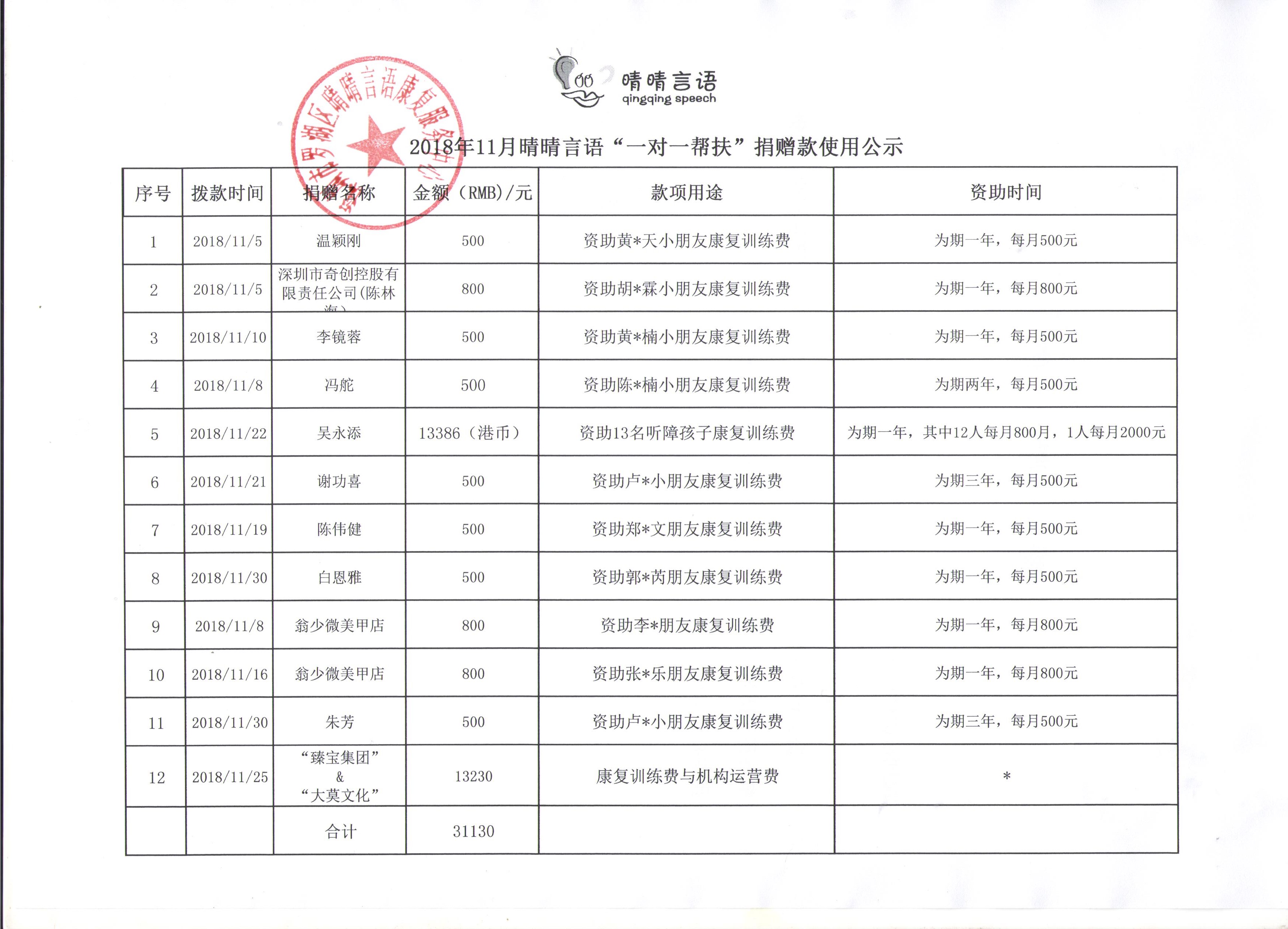 2018年11月晴晴言语“一对一帮扶”捐赠款使用公示