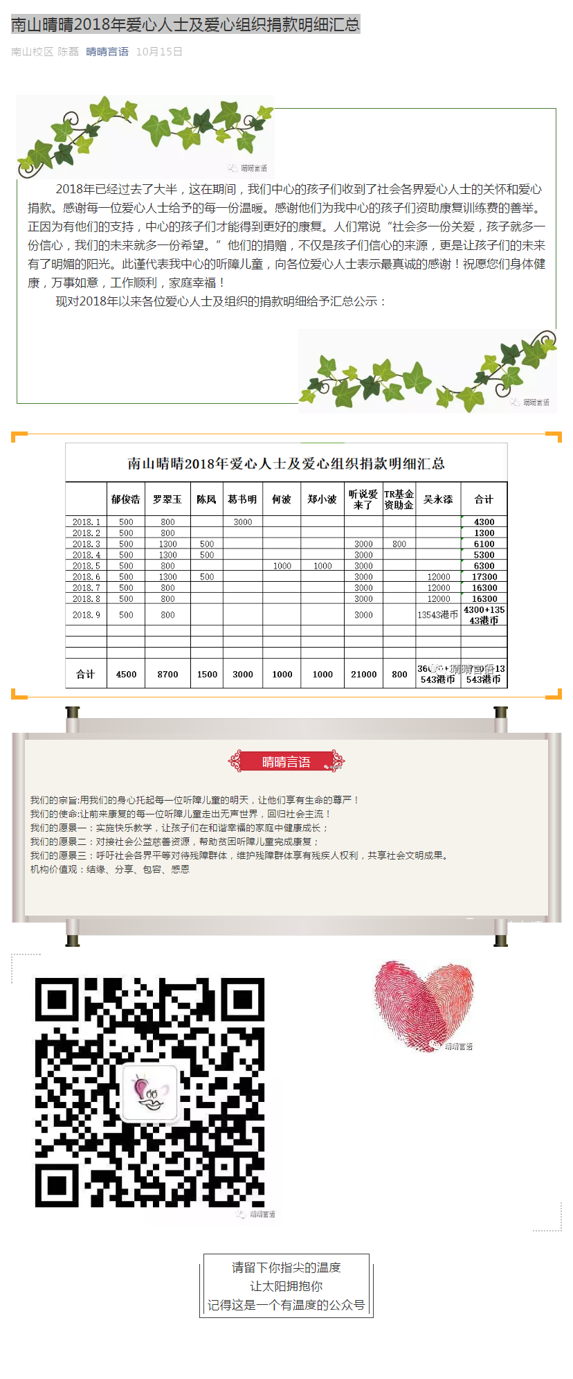 南山晴晴2018年爱心人士及爱心组织捐款明细汇总