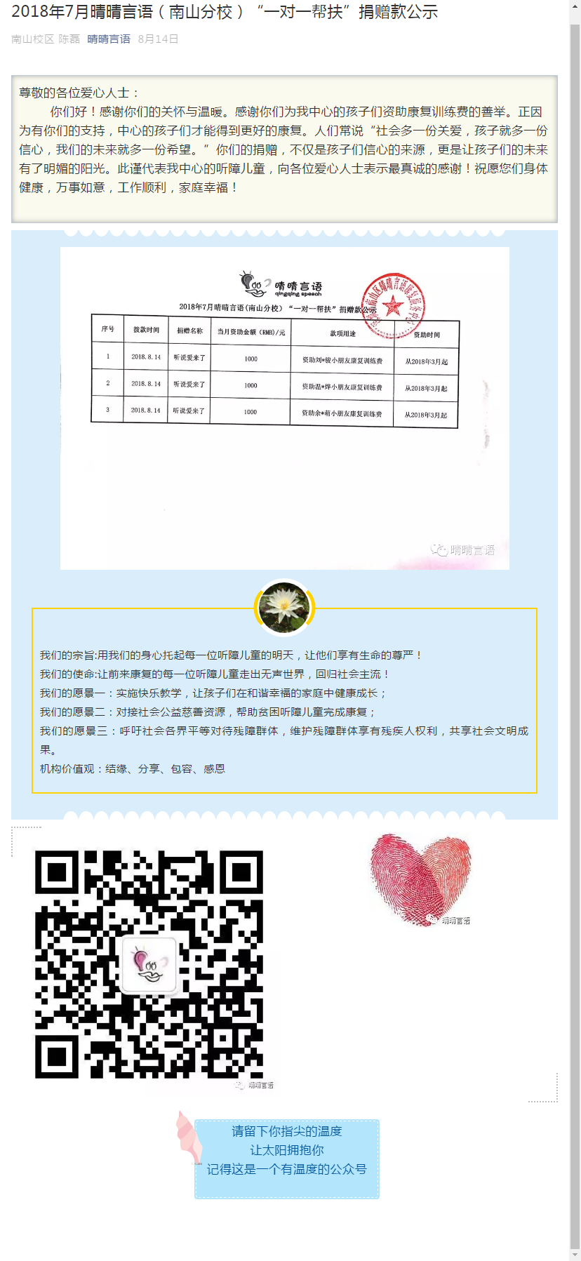 2018年7月晴晴言语(南山分校)“一对一帮扶”捐赠款公示