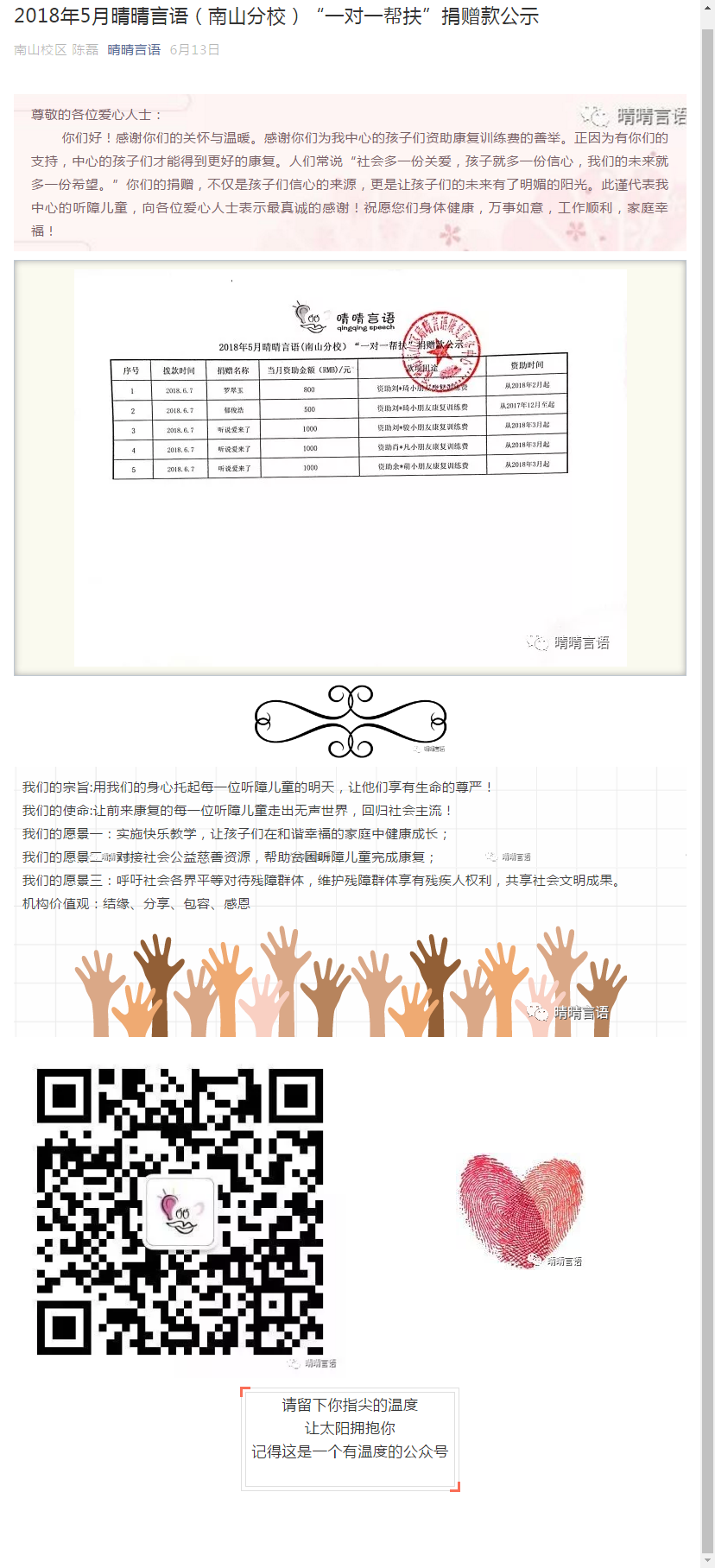2018年5月晴晴言语(南山分校)“一对一帮扶”捐赠款公示