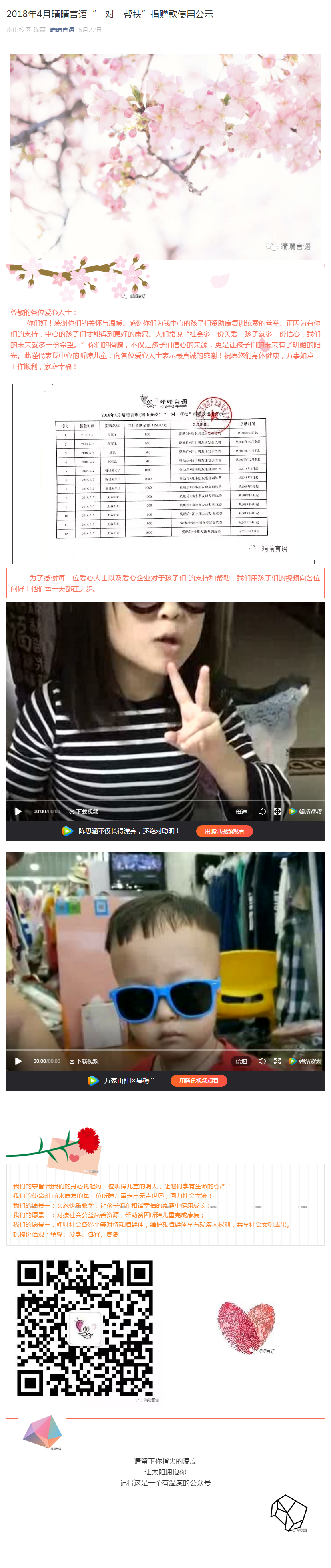2018年4月晴晴言语(南山分校)“一对一帮扶”捐赠款公示
