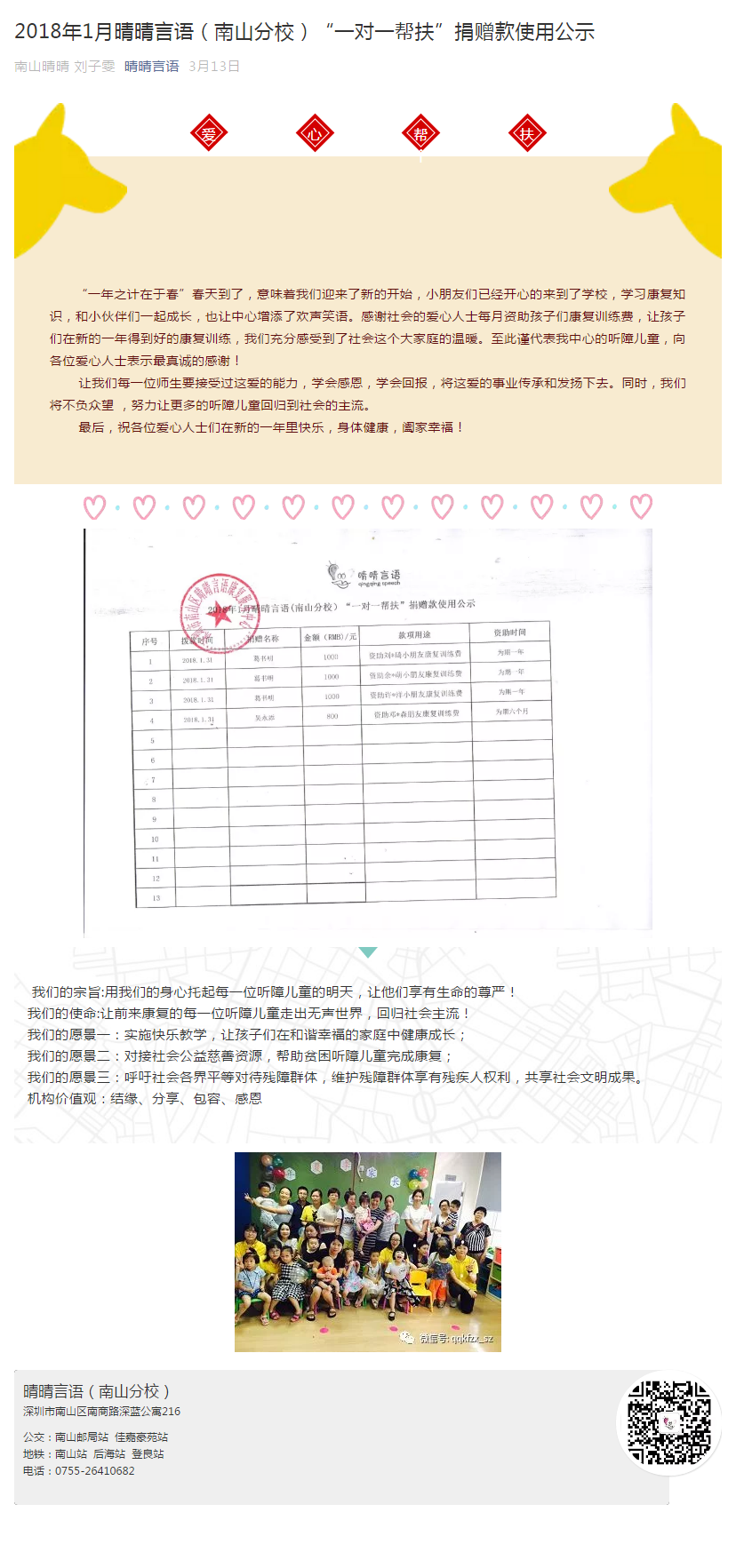 2018年1月晴晴言语(南山分校)“一对一帮扶”捐赠款使用公示
