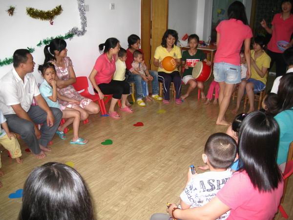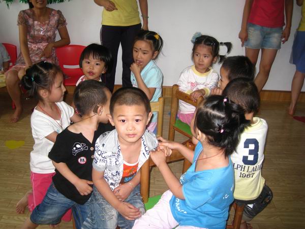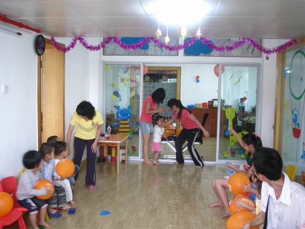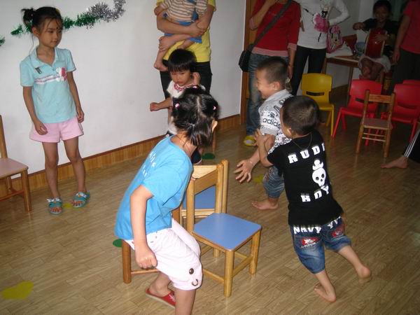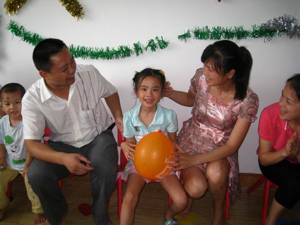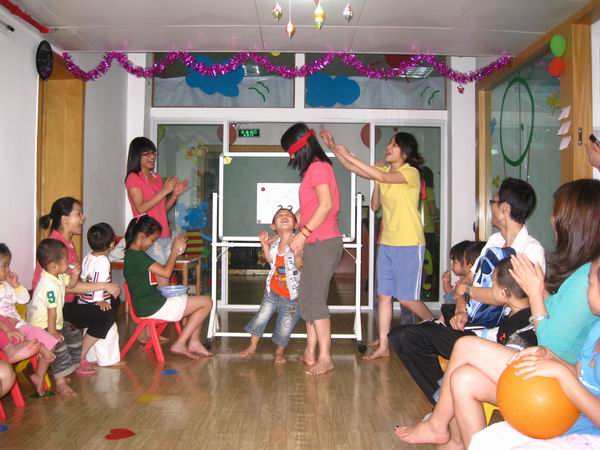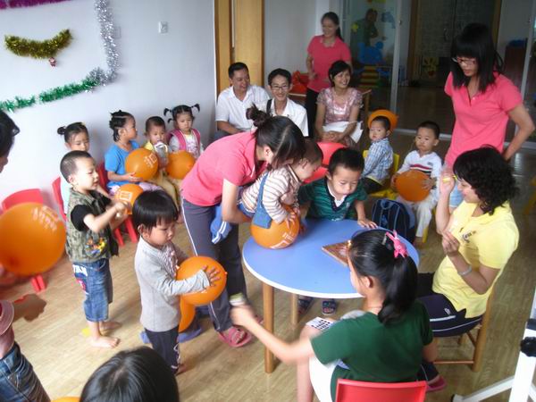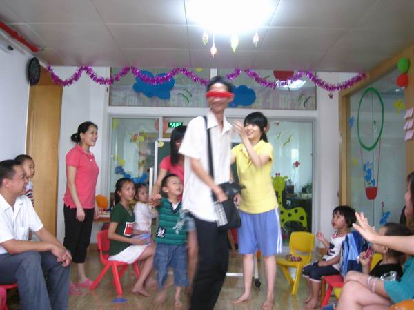下午三点,爸爸妈妈们在相约时间来到中心,和小天使们一块儿过节!在老师们的带领下展开有趣激烈的游戏比赛。先是听鼓声开火车,长长的“火车”把整个活动室都绕了一圈;然后是盲人贴鼻子,歪歪的鼻子总是引来哄堂大笑;还有爬圆筒隧道,充满迷幻的圆筒隧道让好奇心强、勇于探险的孩子们一遍一遍地爬过……