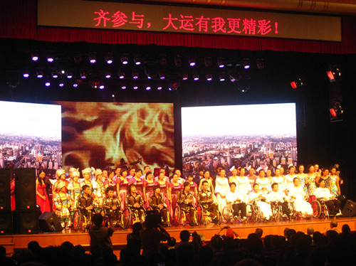 残疾人用他们的自尊、自强、自立的歌声和优美的舞姿欢度节日,为大运加油助威。主持人在台上深情地说:“他们看不见太阳的光芒,也能唱出心灵的悸动 ;他们听不见音乐的美妙,也能捕捉青春的风采;他们迈不出矫健的步伐,也能跳出动感的舞步……”深情的话语打动了在场每个人的心。