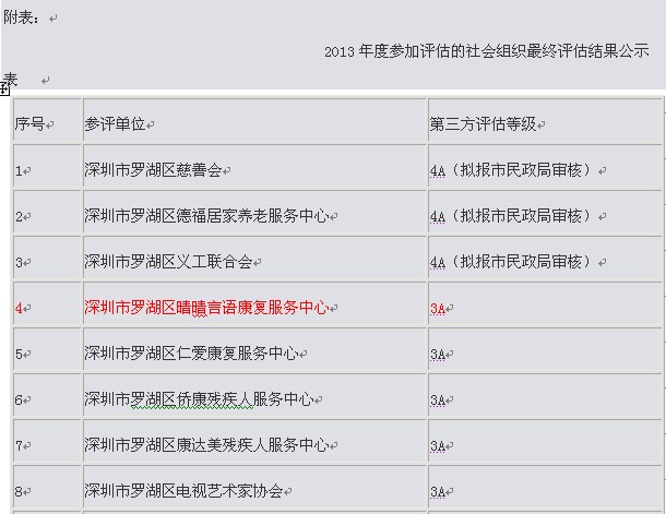 根据深圳市民政局《关于印发<深圳市社会组织评估管理办法(试行)>》及罗湖区民政局《关于印发<深圳市罗湖区社会组织评估管理办法(试行)>的通知》,罗湖区民政局于2013年12月13日完成了罗湖区社会组织评估结果专家评审工作。初评共有11家单位获得3A以上等级。拟报市级审批。
