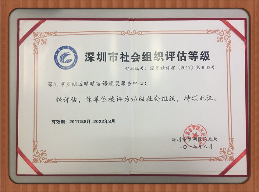 2016年3月,晴晴言语按照《社会组织评估管理办法》(民政部2010年第39号令)、《民政部关于探索建立社会组织第三方评估机制的指导意见》、《关于开展2016年罗湖区社会组织评估工作的通知》(罗民〔2016〕101号)等文件要求,向罗湖区民政厅民间组织管理局报送民办非企业单位申报资料,进行参评资格审核。由第三方评估机构审查,评估专家对我中心实地考察、市社会组织总会评估委员会评定等程序,最终评出5A级社会组织2家、4A级社会组织2家、3A级社会组织1家。