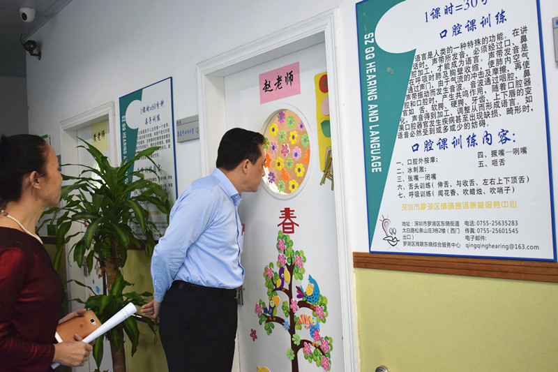 (图为贺书记在课室外观看康复教师给听障孩子上课)
