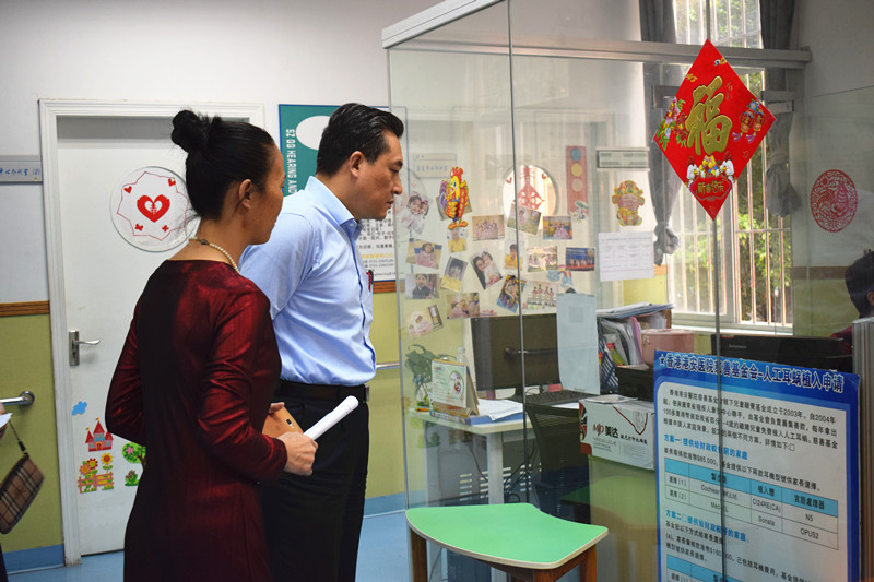 (图为李老师向贺书记介绍晴晴言语和香港港安基金合作申请耳蜗的流程)