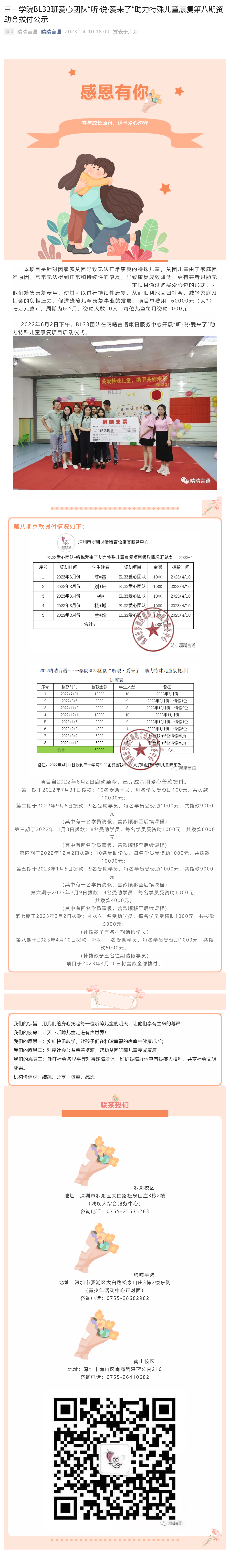三一学院BL33班爱心团队“听·说·爱来了”助力特殊儿童康复第八期资助金拨付公示