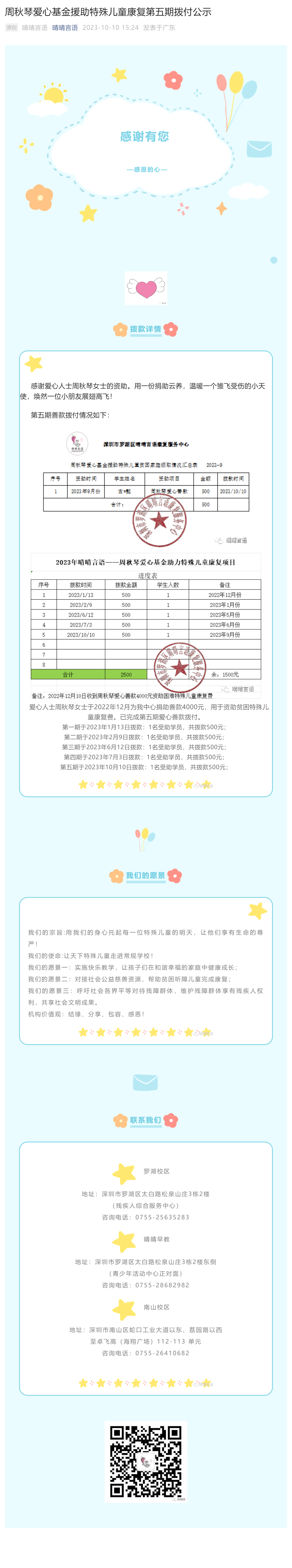周秋琴爱心基金援助特殊儿童康复第五期拨付公示