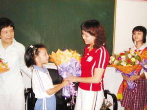 5月9日,在社区举办的母亲节活动中,优秀母亲伍雪玲与现场的母亲们分享了她不平常的育儿心得,赢得听众阵阵掌声和泪水。听力、说话已和普通小孩无异的8岁女孩晴晴为伍雪玲献上了一束康乃馨,以感谢母亲多年来的照顾和培养。